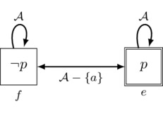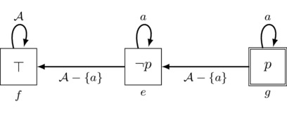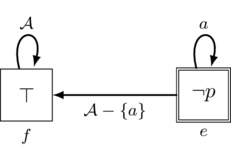 \[\begin{gather*} F \ccoloneqq p \mid F \wedge F \mid \neg F \mid [a]F \\ \small p \in \sP,\; a \in \sA \taglabel{ML} \end{gather*}\]Formulas \([a]F\) are assigned a reading that is doxastic (“agent a believes F”) or epistemic (“agent a knows F”), with the particular reading depending on the application one has in mind. In this article we will use both readings interchangeably, choosing whichever is more convenient in a given context. In the language \eqref{ML}, Boolean connectives other than negation \(\lnot\) and conjunction \(\land\) are taken as abbreviations in terms of negation in conjunction as is familiar from any elementary Logic textbook. See Appendix A for further details on \eqref{ML} and its Kripke semantics.