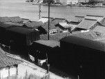 As the end of the train reaches the center of the frame—the sound continues but there is a cut to a closer shot of the train from the hill side, so that it is now moving up along a diagonal to the left. Behind the houses on the other side of the train is the estuary again. As the train's whistle blows—there is a cut to a shrine surrounded by pine trees and statuary standing on an embankment with the estuary in the background on the far left. Continuity is provided by a chimney in the foreground that spouts smoke as the train's steam whistle continues. The main line has reverted to a horizontal line rising toward the right. After six seconds, the shortest scene so far—there is a cut to a grandfather and grandmother sitting on the tatami matting of their home in the village, facing toward the right. The grandfather, consulting a timetable, says, “We'll pass Osaka at around 6:00 this evening,” referring to a train trip they are just about to take to Tokyo, which will initiate the film's main action.