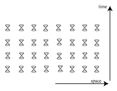 We depict flat spacetime by keeping all the lightcones oriented in the same direction, as in the following figure.