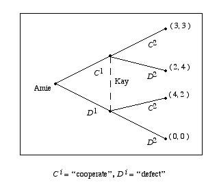This tree is an example of a game in extensive form. At each stage i, the agent who moves can either choose Ci, which corresponds to helping or cooperating, or Di, which corresponds to not helping or defecting. The relative preferences of the two agents over the various outcomes are reflected by the ordered pairs of payoffs each receives at any particular outcome. If, for instance, Fiona chooses Ci and Alan chooses Di, then Fionas payoff is 0, her worst payoff, and Alans is 4, his best payoff. In a game such as the Figure 1.1.a game, agents are (Bayesian) rational if each chooses an act that maximizes her expected payoff, given what she knows.