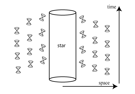 The curvature of spacetime, then, will be depicted by the tilting of these lightcones. This reflects the fact that the causal structure of such spacetimes is different from that of flat spacetimes. So, for example, the spacetime around a massive body like a star will be depicted as follows.