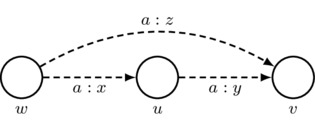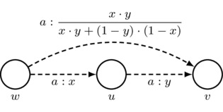 Also, for convenience, we adopt the following rule for simplifying drawings: for each agent a, every sequence of two a-labeled arrows that has different starting and ending worlds gives rise to an implicit third a-labeled arrow whose number is such that the third axiom of priority spaces is satisfied. Thus, if \(w\neq v\) and \(x\cdot y+(1-y)\cdot (1-x)\neq 0\), then