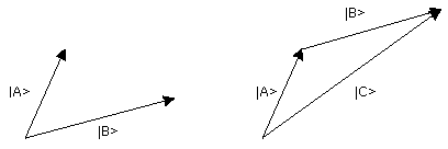 A vector A, written ‘|A>’, is a mathematical object characterized by a length, |A|, and a direction. A normalized vector is a vector of length 1; i.e., |A| = 1. Vectors can be added together, multiplied by constants (including complex numbers), and multiplied together. Vector addition maps any pair of vectors onto another vector, specifically, the one you get by moving the second vector so that it’s tail coincides with the tip of the first, without altering the length or direction of either, and then joining the tail of the first to the tip of the second. This addition rule is known as the parallelogram law. So, for example, adding vectors |A> and |B> yields vector |C> (= |A> + |B>) as in Figure 1: