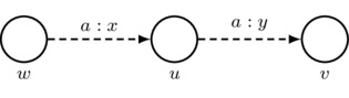 Also, for convenience, we adopt the following rule for simplifying drawings: for each agent a, every sequence of two a-labeled arrows that has different starting and ending worlds gives rise to an implicit third a-labeled arrow whose number is such that the third axiom of priority spaces is satisfied. Thus, if \(w\neq v\) and \(x\cdot y+(1-y)\cdot (1-x)\neq 0\), then